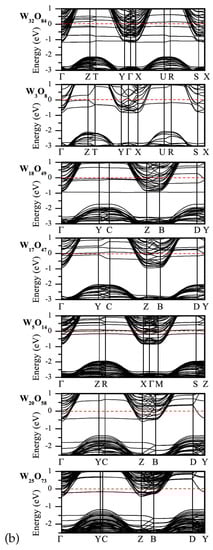 There are quite a few first-principles studies of WO regarding its electronic structure [15,16], role of oxygen vacancies [17,18,19], and cation doping [20,21,22] (for more references see review [15]) but not as much of Magnéli phases of the tungsten oxide. As far as we know only the work of Migas et al. [23] contains results for the band structure for all Magnéli phases (see Figure 1)), though it does not include effects of the spin-orbit coupling. In that paper, the authors have shown that Magnéli phases of tungsten oxides (WO, WO, WO, WO, WO, WO, and WO) demonstrate the metal-like properties. One of the main features of the band structures is an energy gap of about 1 eV right below the Fermi level. A trend could be traced: the closer the stoichiometry of WO to WO, the smaller the charge carrier concentration. Also, the spin-polarized calculations for the WO phase does not reveal any magnetic moment and it is claimed that this is valid for the other phases [23].