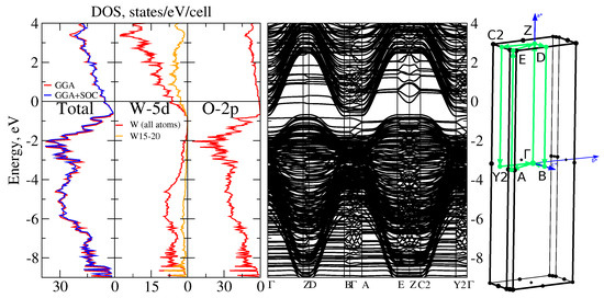 DOS and the band structure in a wide energy range for WO are shown in Figure 3. Band structure clearly shows a small gap just above eV. As is evident from DOS, the states under the gap originates mostly from oxygen while the states above the gap are mostly from tungsten. This comes from the absence of two oxygen atoms in WO as compared to the WO (equivalent to WO) band insulator system. Oxygen deficiency provides four unbound electrons which occupy the W-5d states. It can be checked by the integration of the total DOS in the energy interval from eV to 0 that gives nearly four electrons. Please note that almost three of these electrons belong to the tungsten atoms W15–W20 located along the zigzag stripe in the crystal structure (see Figure 2) while the rest of tungsten atoms have practically empty 5d shells. Those four extra electrons should occupy the orbitals, which are lowest in energy of the W-5d manifold. Introduction of SOC does not lead to any notable changes in the total DOS.