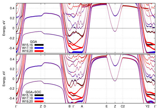To demonstrate the importance of the tungsten atoms W15–W20, we plot their contributions to the bands near the Fermi level in Figure 4. Contributions from other tungsten atoms near the Fermi level are almost negligible. SOC does not lead to any notable changes of the bands near the Fermi level. However, the spin-orbital coupling leads to the disappearance of the electron pocket around the B point and the disappearance of two smaller electron pockets in the direction.