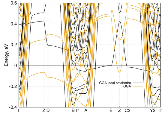 Additional complexity of the WO system comes from the structure of the WO octahedra, i.e., they are all distorted and the O-O bond length ranges from 2.63 Å to 2.72 Å. To see what would happen for an idealized structure, we have turned all WO octahedra into ideal ones with the average O-O bond length equal to 2.68 Å [28]. Thus, the bases of all ideal octahedra create the “square lattice”. In Figure 6, we present the comparison of band structures for the real WO considered here and for the model system with the ideal octahedra from Ref. [28]. In the latter case, the main noticeable feature is the appearance of the flat bands near the Fermi level in the direction. Those bands originate from the d-states of tungsten atoms located along the zigzag stripe, see Figure 2. On the one hand, there is indeed some simplification of the electronic structure: only 6 bands per one spin projection is crossing the Fermi level in contrast to 10 for the real system without SOC. On the other hand, the Fermi surface becomes more “three-dimensional” for the idealized structure, i.e., the central part is a closed surface contrary to the distorted cylinder in the real system, see Figure 5.