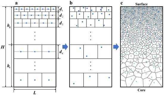 During deformation, shear bands preferentially form at sites where stress concentration occurs [37,58]. Usually, stress concentration appears at the interfaces between materials with contrasting mechanical properties, as shown in molecular dynamics simulations [59,60]. Hence in gradient nano-grained metals, the stress concentration locations pertain primarily to grain boundaries between grains with different grain sizes, which can also be observed from the stress distribution maps obtained from molecular dynamics simulations [61,62]. Therefore, in the current finite element model, the grain size gradient microstructure of the gradient nano-grained Cu was explicitly generated using the Voronoi tessellation method. Figure 3 summarizes the generation process, where the blue dots correspond to the seeds, namely the control points, of each grain. First, the seeds are put at the center of the ideally arranged grains (Figure 3a). Then, perturbations are applied to the initial seed positions (Figure 3b), so that random grain boundaries can be developed, as shown in Figure 3c. As indicated in Figure 3a, the grain size of the layer and the CG core are denoted by and , respectively. According to the experimental data [9,63], the grain size distribution along the thickness direction in the gradient Cu follows the relation: