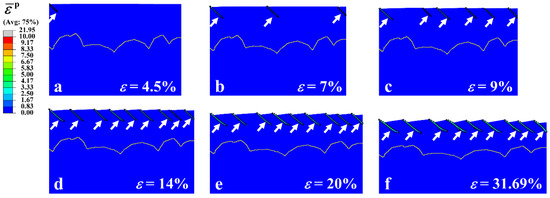 (a–f) Evolution of shear bands in the gradient Cu with applied strain ε. Regions with equivalent plastic strain larger than 1 are shown by black dashed lines. Shear bands are indicated by white arrows. The yellow lines are dividing lines between the CG core and the GSL.