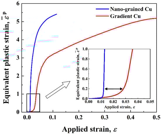 Evolution of the equivalent plastic strain at the sites (indicated by the red crosses in Figure 5c,e) inside the shear bands of the NG and the gradient Cu.
