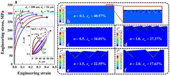 Figure 8a shows the engineering stress-strain curves of the gradient Cu with different grain size distribution indexes n from 0.1 to 2. Uniform elongation is denoted by the symbol ‘×’. The corresponding deformation behaviors of the gradient structures at uniform elongation are depicted in Figure 8b–f. Regions with equivalent plastic strains larger than 1 are enclosed by black dashed lines. Here the GSL thickness hg, surface grain size d1, and core grain size dc were fixed at 75 μm, 100 nm, and 36 μm, respectively. The grain size distributions along the thickness direction of the material for different n are shown in the inset of Figure 8a, in which each dot on the curves represents one homogeneous layer in the GSL of the gradient material. Different from the simulations in the last section, no notch was introduced into the model in the current and subsequent sections since the non-uniform deformation can be induced by the heterogeneous structure in the gradient Cu. The results show that as n increases, the yield strength of the gradient material increases, while the ductility decreases. For example, at n = 0.1, the yield strength of the gradient Cu was 79.9 MPa, which is nearly one-third of that of the material with n = 2, i.e., . However, the ductility of the former () was more than twice that of the latter (). An important contribution to the high ductility of the gradient Cu with low n is the strain delocalization in the surface nanocrystalline region. As shown in the inset of Figure 8b, a large number of shear bands were formed on the surface of the gradient structure when n = 0.1. By contrast, only three shear bands were formed at n = 2, inducing the low ductility of the material.
