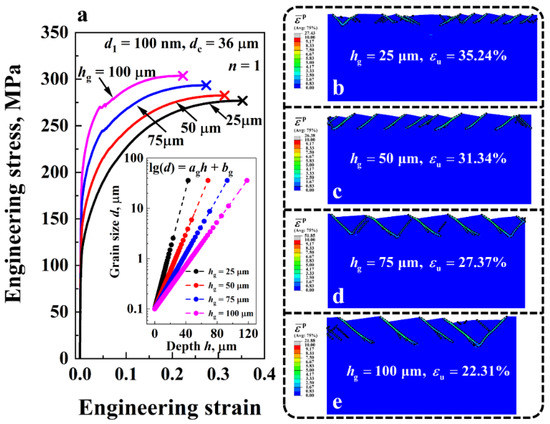 Figure 9a compares the engineering stress-strain curves of the gradient Cu with different GSL thicknesses hg ranging from 25 μm to 100 μm. The uniform elongation is represented by the symbol ‘×’. The corresponding deformation behaviors of the gradient structures at the uniform elongation are shown in Figure 9b–e. Regions with an equivalent plastic strain larger than 1 are enclosed by black dashed lines. Here the grain size distribution index n, surface grain size d1, and core grain size dc were adopted as 1, 100 nm and 36 μm, respectively. The grain size distributions along the thickness direction of the material for different hg are shown in the inset of Figure 9a. The results show that the ductility of the gradient Cu declined as hg increased, while its yield strength exhibited the opposite trend of increasing. For instance, from hg = 25 μm to hg = 100 μm, the uniform elongation of the material decreased from 35.24% to 22.31%, but the yield strength increased from 106.56 MPa to 187.81 MPa. As can be seen from Figure 9b,c, the difference in the shear band pattern of the gradient Cu with different hg is a major cause of the discrepancy in ductility. When hg was small, a large number of shear bands were formed at the surface of the material, e.g., Ns = 24 for the case of hg = 25 μm, delocalizing plastic strain in the NG layers. By contrast, only 10 shear bands (Figure 9e) were induced in the gradient structure with a large hg of 100 μm, which reduced the ductility of the material.