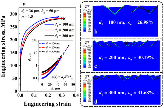 The engineering stress-strain curves of the gradient Cu with three distinct surface grain sizes d1, i.e., 100 nm, 200 nm and 300 nm, are plotted in Figure 10a. On the curves, the symbol ‘×’ denotes the uniform elongation. The core grain size dc, the GSL thickness hg, and the grain size distribution index n were set to be 36 μm, 50 μm, and 1.5, respectively. Figure 10b–d presents the corresponding deformation behavior of the gradient Cu with different d1. It can be seen in Figure 10a that the ductility of the gradient material increased as d1 increased, while its strength diminished. That is, for the case of d1 = 100 nm, the uniform elongation and the yield strength of the material were 26.98% and 155.65 MPa, respectively. When d1 increased to 300 nm, and of the material were 31.68% and 128.2 MPa, which are 117% and 82% of those of the values for the case of , respectively. The enhanced ductility of the gradient Cu with large d1 was attributed to the strain delocalization effect at the surface of the material. From Figure 10b–d, we can see that only five shear bands were formed in the case of d1 = 100 nm. By contrast, there were 13 shear bands in the gradient Cu when d1 was 300 nm, which is nearly three times the number of shear bands in the gradient Cu with d1 = 100 nm. The large number of shear bands delocalized the plastic strain in the NG layers of the material, and therefore elevated the ductility.