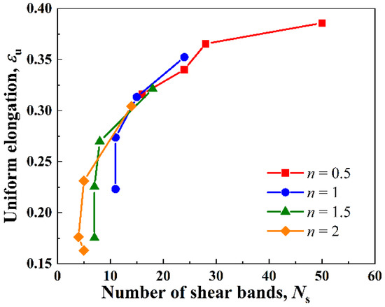 Figure 11 summarizes the relation between the uniform elongation and the number of shear bands Ns of the gradient Cu. Four cases of grain size distribution indexes, i.e., n = 0.5, 1, 1.5, and 2, are considered here. For each curve in Figure 11, the GSL thickness hg varied from 25 μm to 100 μm. The surface grain size d1 and the core grain size dc were fixed at 100 nm and 36 μm, respectively. The results show that the uniform elongation, i.e., ductility, of the gradient Cu was positively correlated with the number of shear bands formed in the material. The highest ductility i.e., a uniform elongation of , was achieved in the case with n = 0.5 and hg = 25 μm, where 50 shear bands were formed in the material.