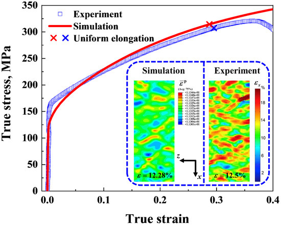 Comparison of the engineering stress-strain curve between the 3D simulation and the experimental data [36]. The strain distribution at the top surface (in the xz-plane) of the sample under the applied strain of ~12.5% in both the simulation and the experiment are presented in the inset. The experimental strain map was reprinted from [36] with permission from Elsevier.