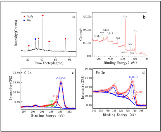 It is well-known that XPS is often used to verify the elemental composition of materials. Therefore, XPS was applied for component analysis, and the full scan spectrum is presented in Figure 2b, it can be seen that the main composition elements of SMB were C, N, O, and Fe. Besides, there were some broad and low intensity peaks belonging to impurities such as Na, Ca, Si, and Al. The mass fractions of impurities in the product were all less than 5% and the concentration of these impurities can be seen in Table 1. At the same time, the strong C peak and high surface concentration (At% = 55.31) indicated that the main component of the sample surface was carbon. Therefore, the binding energy peak of C1s was displayed in the high-resolution spectrum (Figure 2c) to explore the C-containing functional groups present on the surface of SMB. It could see that the C-C/C=C peak at 284.88 ev is the strongest, and there were also C=O and C-O peaks. In addition, the high-resolution spectrum of Fe was shown in Figure 2d. The peaks of Fe3+ and Fe2+ were not equivalent, indicating that there was not only Fe3O4 in SMB but also FeOOH. FeOOH was the incompletely reacted part of the raw iron mud. The binding energy peaks of Fe was very weak, and the surface concentration was also low (At% = 4.68), indicating that the core of Fe3O4 may be hidden in the carbon shell.