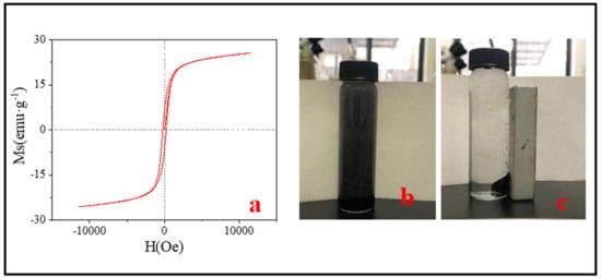 Magnetic separation capacity is very important for the separation and recovery of adsorbents. The magnetic properties of SMB were measured by the VSM experiment. From the hysteresis loop of Figure 4, the saturation magnetization (Ms), the magnetic remanence (Mr), and the coercivity (Hc) values were 25.60 emu·g−1, 6.10 emu·g−1, and 205.20 Oe, respectively. The saturation magnetization was significantly lower than the ferromagnetism of Fe3O4 (90 emu·g−1) [44]. The reason for this phenomenon may be the following two aspects: (1) XRD and TEM results showed that the structure of carbon shell coated on iron oxide core possibly was formed. In addition, after measurement, the thicknesses of the carbon shells were between 16 nm–200 nm (Figure 3f). The existence of the carbon layer reduced the magnetic properties of SMB; (2) The reaction material sewage sludge and iron mud were not purified, resulting in impurities in the SMB, and the presence of these impurities had an impact on the magnetic properties of SMB. Besides, the presence of impurities may also be the reason for the presence of Mr and Hc. According to the study by Ma et al., magnetic materials can be used for magnetic separation when the magnetization reaches 16.30 emu·g−1 [45]. Despite the magnetic properties of SMB was only 25.60 emu·g−1, it could still be easily separated from the solution within 1 min with an ordinary magnet (Figure 4b,c).