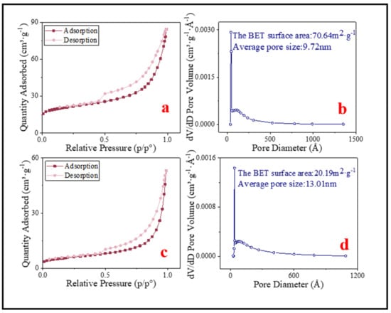 According to the IUPAC classification, the N2 adsorption–desorption isotherms of BC and SMB both belong to type IV isotherms with hysteresis loops of type H3 (Figure 5a,c). In addition, the average pore size of the samples can be obtained from the BJH (Barrett, Joyner, and Halenda) pore size distribution chart (Figure 5b,d). All the specific surface areas and the average pore diameters were marked in Figure 5. The BET of BC and SMB were 70.64 m2·g−1 and 20.19 m2·g−1, respectively. In addition, the average pore diameters were 9.72 nm and 13.01 nm, respectively. This indicated that BC and SMB were both mesoporous materials.