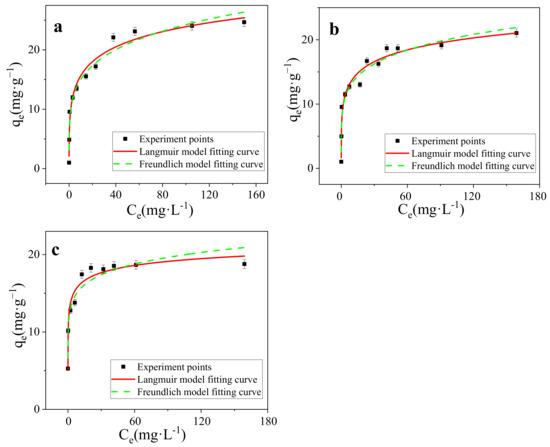 The adsorption isotherm is the definition of the relationship between the amount of adsorbate adsorbed per unit mass of adsorbent and adsorbate concentration in solution phase at constant temperature and at equilibrium condition [37]. As shown in Figure 7a–c), the sorption isotherm of MB onto SMB was “L” shape. The equilibrium adsorption capacity of MB on SMB increased with the increase of the initial MB concentration, similar findings have been found in previous studies [34,50]. In order to find the most suitable adsorption model, data was fitted to Langmuir (Equation (4)) and Freundlich (Equation (5)) sotherm models. The Langmuir isotherm can also be expressed by RL (separation factor), the formula is shown in Equation (6) [54].