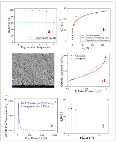 (a) Regeneration of SMB; (b) Isotherm models of SMB after one regeneration (298 K); (c) SEM image of SMB after one regeneration; (d) N2 adsorption–desorption isotherm liner plots of SMB after one regeneration; (e) BJH pore size distribution of SMB after one regeneration; (f) Adsorption capacity of SMB after one regeneration of hydrochloric acid at different concentrations.