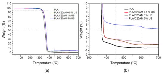 - Iturrondobeitia, M.; Okariz, A.; Guraya, T.; Zaldua, A.-M.; Ibarretxe, J. Influence of the processing parameters and composition on the thermal stability of PLA/nanoclay bio-nanocomposites. J. Appl. Polym. Sci. 2014, 131. [Google Scholar] [CrossRef]