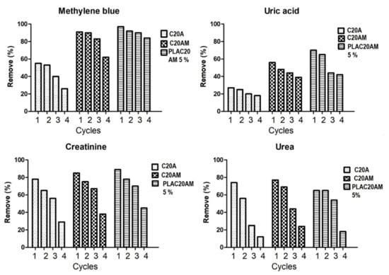 3.3. Adsorption of Uremic Toxins and Dyes
