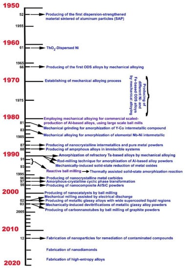 Milling is the process of reducing relatively coarse materials to a desired fineness []. This process is a common routine approach of comminuting procedure used in mineral dressing to separate precious mineral grains from mother rock by rotating cylindrical steel vessels holding a charge of free-moving balls within the mill []. Mechanical alloying (MA) [] is a typical solid-state process that occurs at room temperature between powders of diffusion couples utilizing various types of ball mills. Ball milling has evolved over the last five decades from a standard technique in mineral dressing and powder metallurgy, where it was primarily used for particle size reduction and powder blending, to its current prominence as a powerful method for the preparation of materials with improved physical and mechanical properties, as well as new phases and engineering materials. MA is widely regarded as one of the most efficient nanotechnology techniques for the top-down preparation approach of a broad variety of nanocrystalline, nanoparticles, and nanocomposites materials. As a result, the term MA is becoming increasingly prevalent in the materials science, metallurgy, and nanotechnology literatures []. The MA method, which incorporates several types of milling equipment [], has garnered much attention as a powerful tool for producing a range of advanced materials. Figure 1 depicts a schematic history of the evolution of the mechanical alloying process since 1950.