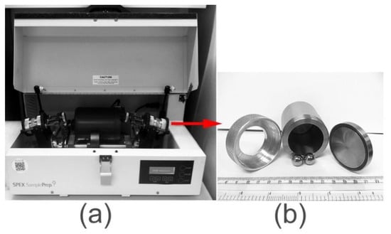 SPEX is one brand of shaker mill (SPEX CertPrep, Inc., Metuchen, NJ, USA). The manufacturer offers two models: the Spex 8000M (Figure 4a) and the Spex 8000D. The first model suspends a single vial in an arm that oscillates rapidly along multiple axes, whereas the second model suspends two vials in two arms. At around 1200 rpm, the mill agitates the powder through the balls’ motions in the three perpendicular directions.