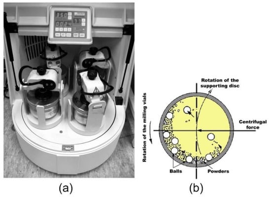 Planetary Ball Mills (Figure 5a) are commonly utilized mills in MA and MD processes for synthesizing nearly all types of metastable, and composite materials. Because the milling stock and balls exit via the inside wall of the vial (milling bowl or vial), and the effective centrifugal force (Figure 5b) in this type of mill may reach up to twenty times the gravitational acceleration, the milling media carries a tremendous amount of energy. The milling charge is propelled forward by centrifugal forces generated by the rotating supporting disc and the vial’s self-turning action (balls and powder). Because the supporting disc and the vial have opposing rotating orientations, the centrifugal forces are alternately coordinated and resisted. As a consequence, the grinding medium and charged powders alternately roll on the inner wall of the vial before being lifted and thrown across the bowl at high velocity, as schematically illustrated in Figure 5b.