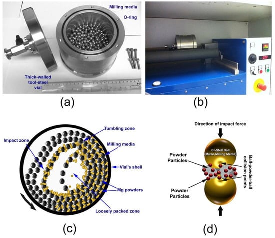 The useful kinetic energy can be transferred to the powder particles of the reactant materials in these types of mills (Figure 6a,b) via (2) collisions between the balls and the powders (Figure 6c,d); (2) pressure loading of powders pinned between milling media or between the milling media and the liner (Figure 6c); (3) impact of the falling milling media, shear, and abrasion caused by draping (Figure 6c). Ball mill tumblers have been used to successfully produce a variety of mechanically alloyed powders. (See, for example, Ref. []). However, while this type of low energy mill may increase the amount of time necessary to complete the MA process, it generates homogenous and uniform powders []. Additionally, it is less costly than systems that use a lot of energy. Additionally, tumbling mills are low-maintenance and easy to run (Figure 6b).
