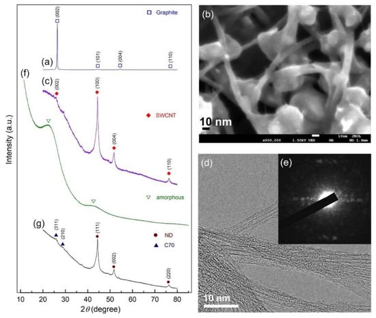 We used both X-ray diffraction (XRD) and field emission high resolution electron microscopy (FE-HRTEM) techniques to track the progress of phase transitions during high energy ball milling of graphite powders at various milling speeds. The XRD patterns of the beginning graphite powders acquired during the early stages of ball milling (0–16 h) are shown in Figure 8. As illustrated in Figure 8a, the initial graphite (G) powders had large-scaled crystallites, as evidenced by the sharp Bragg peaks corresponding to hexagonal close packed, hcp- (002), -(101), -(004), and -(110). After 10 h of ball milling, the pattern displayed Bragg peaks indicative of single wall carbon nanotubes, SWCNs (PDF# 00-58-1638), as illustrated in Figure 8b []. The high-magnification field emission scanning electron microscope (FE-SEM) micrograph of the powders obtained after this stage of milling (12 h) showed the existence of untransformed G-nanoparticles (10–30 nm in diameter) attached to the surface of the micron-size aggregates SWCNTs (Figure 8b). Formation of metastable SWCNs was confirmed by XRD and HRTEM (Figure 8c,d) as well as the corresponding nano beam diffraction pattern, NBDP (Figure 8e) [].