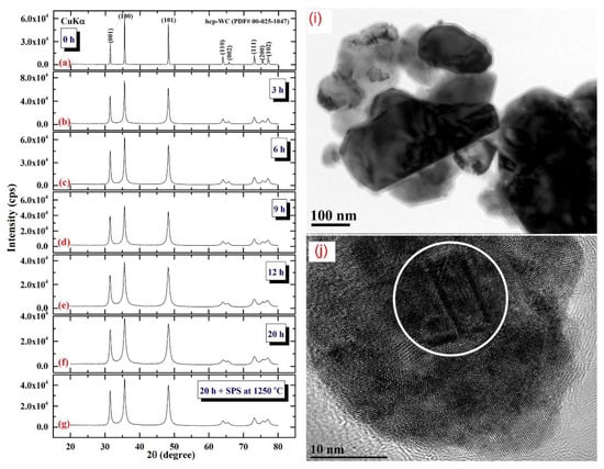 XRD patterns of ball milled WC powders treated for (a) 0, (b) 3, (c), 6 h, (d), 9 h, (e), 12, and (f), 20 h of milling. The powders produced after 20 h of milling and subsequently consolidated into bulk buttons at 1250 °C using the SPS method are depicted in the XRD (g). The bright field images (BFIs) of mechanically milled hcp-of-milling WC powders produced after 1 h and 3 h of high energy ball milling are shown in (i) and (j).