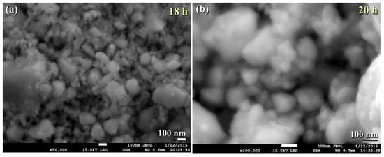 Micrographs FE-SEM ball milled WC powders after (a) 18, and (b) 20 h.