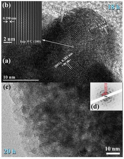 Images of FE-HRTEM for ball milled WC powders and their related selected area diffraction patterns (SADPs) are shown in (a,b) and (c,d), respectively.