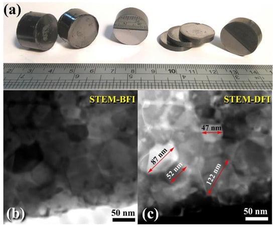 (a) A photograph demonstrating the shapes and sizes of various WC consolidated buttons obtained after the powders for the final product were consolidated (20 h) using the SPS method at 1250 °C. The STEM-BFI and STEM-DFI for the chosen button are depicted in (b) and (c), respectively.