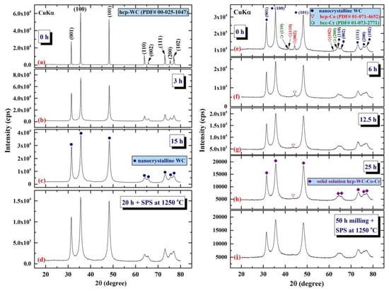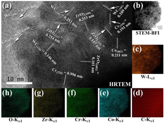 Figure 11 illustrates the XRD patterns of mechanically milled pure hcp-WC powders obtained after varying ball milling times ranging from 0 to 20 h. (Figure 11a–g). Figure 11a shows that as-received powders (0 h) had significant Bragg peaks that were consistent with polycrystalline hcp-WC (PDF# 00-025-1047). This starting material powder had a bulky look and was composed of large particles with an uneven shape, ranging in diameter from 50 to 600 nanometers (Figure 11i). The Bragg peaks of powders milled for 3–6 h MM time exhibited substantial broadening as a result of the grain refining process caused by the milling action (Figure 11b,c). The powders formed after three hours of MM exhibited nano-twin lattice defects and stuck faults in their interior structure, as illustrated in Figure 11j. Additionally, the diameters of the powder particles obtained after three hours of MM were substantially reduced to approximately 28 nm (Figure 11j). Following this stage of MM, the powders comprise a variety of grains ranging in size from 8 nm to 10 nm in diameter. During the intermediate stage (6–12 h), additional broadening of the Bragg peaks was seen, together with a significant drop in their intensities (Figure 11d,e), implying continuing grain refining and the formation of finer particles. Moreover, the WC powders suffered from a great number of lattice imperfections, where clear stacking faults and dislocations existed inside the dark-contrast grains (Figure 12a).