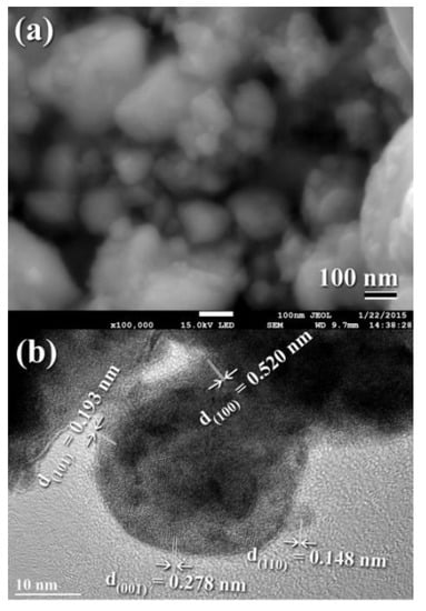 The FE-SEM micrograph demonstrates that the powders generated after 18 h of MM had a wide range of sizes (50–550 nm) and morphologies (bulky-, rugby ball-, and spherical-like shape), as illustrated in Figure 13a. Following this step of MM, the WC powders shown in Figure 13a consisted of nano-sized grains (5–10 nm) of polycrystalline hcp-WC with various lattice planar orientations ((110), (002), (001), and (100)), as illustrated in Figure 14a,b. Due to a decrease in the atomic level strain, the WC crystals were broken along their grain boundaries into nano-dimensional subgrains (Figure 14a). [].