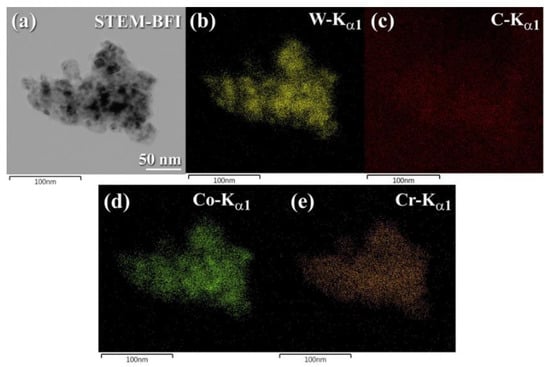 Among the hard materials, tungsten carbide (WC) has received considerable interest due to its unusual chemical and mechanical properties []. WC is an interstitial combination of carbon atoms filling a W crystal []. Since the early twentieth century, WC has been widely employed in the industry as cutting tool tips and wear-resistant parts. Due to its intrinsic resistance to oxidation and corrosion at elevated temperatures, WC is an excellent candidate for protective coatings for high-temperature electronics [,]. Unfortunately, nanocrystalline bulk WC materials are rarely used in industrial scale applications due to their limited sinterability even at elevated temperatures (1650–1900 °C) [,,,]. The possibility of improving mechanical properties including as hardness, elastic modulus, and fracture toughness has sparked interest in the manufacture of nanocrystalline WC ultrafine powders. Numerous methods, including chemical synthesis [], mechanically induced solid state reduction [], plasma-chemical interaction [], and chemical vapor deposition (CVD), can be employed to synthesize polycrystalline superfine WC powders with an average grain size of 300–40 nm. However, mechanical milling (MM) is believed to be the most potent approach for generating nanocrystalline WC ultrafine powders on an industrial scale at near room temperature [,]. It has been demonstrated that ultrafine WC nanopowders with a spherical-like shape may be successfully generated employing WC milling equipment with a ball-to-powder weight ratio of 50:1 []. The milling procedure was carried out for 20 h at a speed of 400 rpm using a planetary-type ball mill.