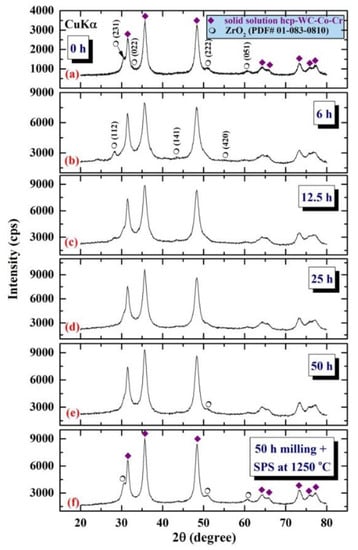 - El-Eskandarany, M.S.; Al-Hazza, A.; Al-Hajji, A.A. Mechanically assisted solid-state mixing and spark plasma sintering for fabrication of bulk nanocomposite (WC/7(10Co/4Cr))-Based ZrO2 systems. J. Mater. Eng. Perform. 2017, 26, 1540–1550. [Google Scholar] [CrossRef]