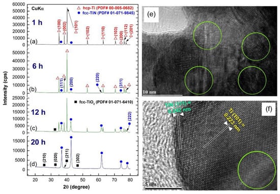 At the conclusion of the MM processing time, the powders realized the benefits of the 20-h milling, showing broad Bragg peaks (Figure 11f). This indicates that the MM process for generating WC nanopowders has been completed. Additionally, the intense ball-powders-ball (a) directed toward (0001) is illustrated in (b). In (d), the lattice resolution and NBDP of a specified area in (c) are combined [].