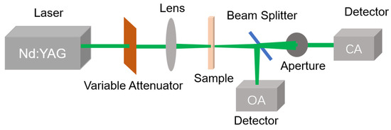 The nonlinear refraction of Ag NPs was investigated by using Z-scan technology. As shown in Figure 1, the Z-scan setup is similar to that described in the existing reports [11,25]. In Figure 1, an Nd: YAG laser system was used as the excitation source emitting 5 ns 532 nm laser with a repetition rate of 10 Hz. The pulsed laser beam has a lateral distribution and a time distribution approximate to the Gaussian distribution. The variable attenuator was used to control the energy of the excitation laser. The lens with a 10 cm focal length was used to focus the laser on the sample. The direction of beam propagation after the lens is specified as the z-axis. The sample is fixed on a translation table controlled by a computer program moving along the z-axis. Two detectors (OA and CA) were used to measure the energy of the pulsed laser transmitting through the sample. The former without apertures in front of the detector is used to measure nonlinear absorption, which is called open aperture (OA) Z-SCAN, while the CA detector with an aperture is applied to measure nonlinear refraction, which is called closed aperture (CA) Z-SCAN. In fact, in order to avoid the influence of nonlinear absorption, nonlinear refraction should be revealed from the transmittance of the CA detector divided by the OA one.