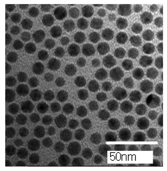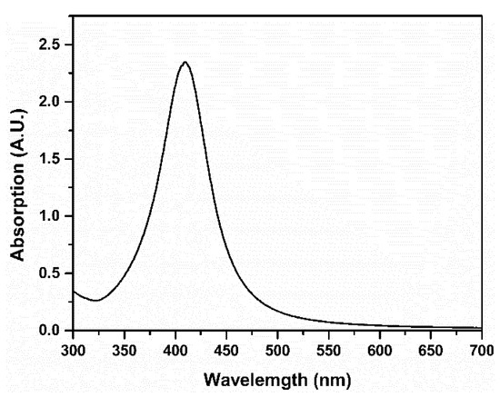 The linear absorption and shape of nanoparticles will affect their optical nonlinear properties [26]. The UV-Vis absorption spectrum of AgNPs is shown in Figure 2. It can be seen from Figure 2 that AgNPs have a strong absorption band at about 410 nm, which can be attributed to the SPR of AgNPs [12,13,26]. The TEM image of AgNPs is shown in Figure 3 and it can be determined that the average diameter of AgNPs is about 10 nm.