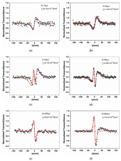 The Nd: YAG laser system was used in this Z-scan study. It provided a pulse width with 5 ns at 532 nm and repetition rate of 10 Hz. In our experiment, a thick quartz cell with 2 mm was used to hold AgNPs solution. The laser energy E is adjusted to 15, 30, 45, 60, 200, and 280 μJ (accordingly, the peak irradiance of the laser beam at the focusing position z = 0 is , , , , and , respectively). The Z-scan results are shown in Figure 4, where the scattered points and red solid curves are experimental data and theoretical fitting (which will be introduced later), respectively.
