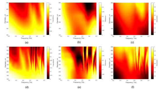Transmittance (T), reflectance (R), and absorptance (A = 1 − T − R) of multilayer system contained the array of polymer hemispheres covered with Ni layer (30 nm thick) and deposed on SiO2 substrate versus hemispheres diameter and frequency. The calculations were performed for the structure organized in the square lattice with 400 μm (a–c) and 600 μm (d–f) period, respectively. The following parameters were used in the simulation: the polymer dielectric permittivity was 2.3; the dielectric permittivity of SiO2 substrate was set 2.7.