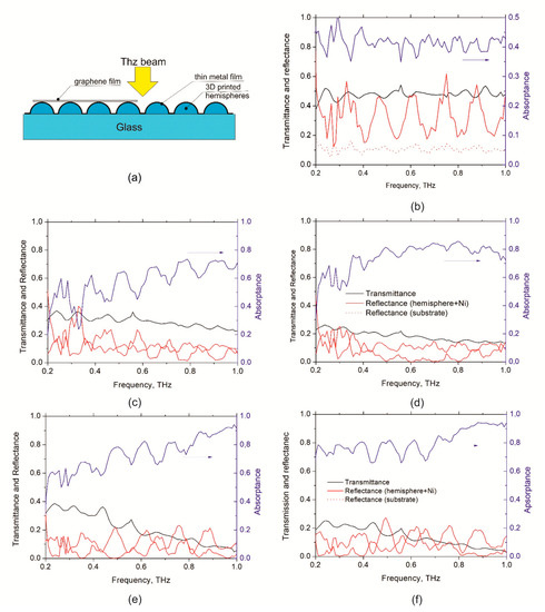 Figure 4c,e show the measured spectra of the transmittance, reflectance and reconstructed absorptance (A) of the fabricated Ni/polymer hemispheres/substrate metasurfaces, whereas Figure 4d,f present the electromagnetic response of graphene/Ni/polymer hemispheres/substrate structures. The spectra for Ni layer, 30 nm thick, deposited on silica substrate are presented for comparison (Figure 4b).