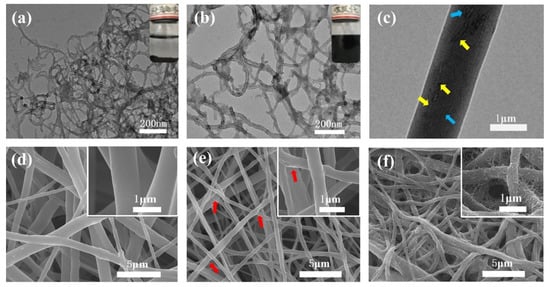 Morphologies of the composites. (a–c) TEM images of MWCNTs (a), a-MWCNTs (b) and TMFM 201 (c). The insets of (a,b) are MWCNTs and a-MWCNTs dispersion, respectively. (d–f) SEM images of pure TFM (d), TMFM 202 (e) and TMMFM-5 (f).