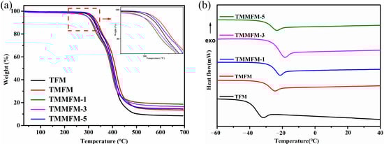 TGA (a) and DSC (b) curves of TFM, TMFM and TMMFM.