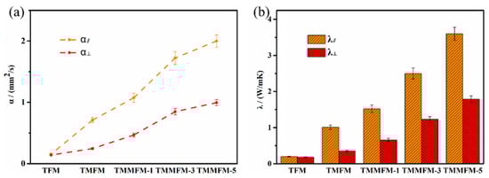 (a) α⊥ and α∥ values of TFM, TMFM and TMMFM. (b) λ⊥ and λ∥ values of TFM, TMFM and TMMFM.
