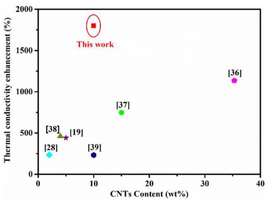 To explore the correlation between the structure of the TMMFM network and the λ of the composites, the cross-plane (λ⊥) and in-plane (λ∥) thermal conductivity were studied. As can be seen in Figure 6a,b, with the mass fraction of a-MWCNTs increasing, the α and λ values of the composites increase greatly. In particular, the λ⊥ and λ∥ values of TMMFM-5 are significantly improved to 1.79 W/mK and 3.6 W/mK, about 13 and 18 times higher than that of TFM (λ⊥ of 0.18 W/mK and λ∥ of 0.2 W/mK), respectively. In order to reflect the excellent thermal conduction enhancement of MWCNTs, in this study, some previously reported CNT-based film-like composites are summarized in Figure 7 and Table S1 [,,,,,]. Among these studies, Jang et al. [] reported that the λ value of MWCNT/PA6 increased by 232% when 10 wt% MWCNTs were introduced. Obviously, in our work, the enhancement of thermal conductivity for TMMFM-5 (with 10 wt% a-MWCNTs loading) is significant in comparison with similar research.