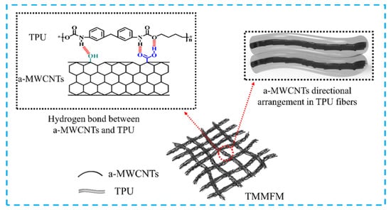 The TPU matrix was first dissolved in the solvent DMF, and a-MWCNTs fillers (mTPU/ma-MWCNTs = 19:1) were added and dispersed by mechanical stirring for 6 h to obtain the corresponding electrospinning solution. The prepared electrospinning solution was loaded into a plastic syringe and fed through a metallic nozzle at a feed rate of 1 mL/h. The applied voltage was 15 kV, the temperature was 25 °C and the distance between the metallic needle and the rotating drum was 15 cm. The a-MWCNTs@TPU fiber membranes were collected on aluminum foil, which was attached to the rotating drum. Afterward, a-MWCNTs@TPU fiber membranes were immersed in the a-MWCNTs dispersion (0.5 mg/mL) and ultrasonicated for 1 min, 5 min and 10 min, respectively, then dried in a 50 °C oven for 24 h to obtain a-MWCNTs@TPU-a-MWCNTs fiber membranes with additional content of approximately 1 wt%, 3 wt% and 5 wt% a-MWCNT, respectively. For comparison, TPU fiber membranes were prepared according to the same method. For convenience, TPU, a-MWCNTs@TPU and three different a-MWCNTs loading a-MWCNTs@TPU-a-MWCNTs fiber membranes were denoted as TFM, TMFM, TMMFM-1, TMMFM-3 and TMMFM-5, respectively. The detailed constitution of fiber membranes is listed in Table 1, and the preparation process of TMMFM is presented in Figure 1.