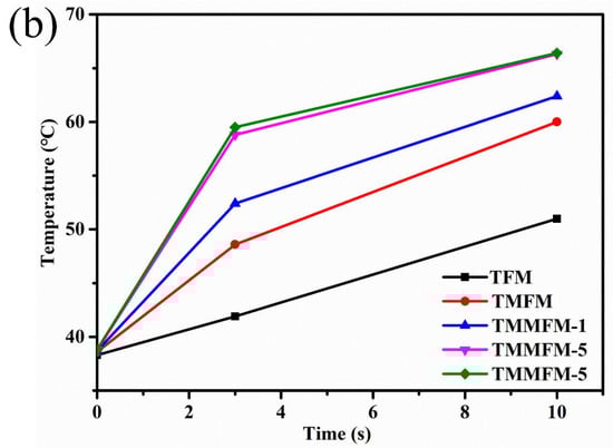 In order to further study the heat transfer performance of the composites, we placed the fiber membranes on a heating plate with constant temperature (70 °C) and recorded their surface temperature at different times by infrared thermal imaging instrument. Figure 9a,b shows the corresponding infrared thermal images and experimental results of fiber membranes. In Figure 9b, with the increase in a-MWCNTs loading anchored on the surface of TPU fibers, the surface temperature of TMMFM increased faster, indicating higher thermal conductivity and better heat transfer capability of the composites. Furthermore, the temperature distribution on the surface of each specimen is even (see Figure 9a), which verifies that a-MWCNTs maintains a uniform dispersion on the macro level.