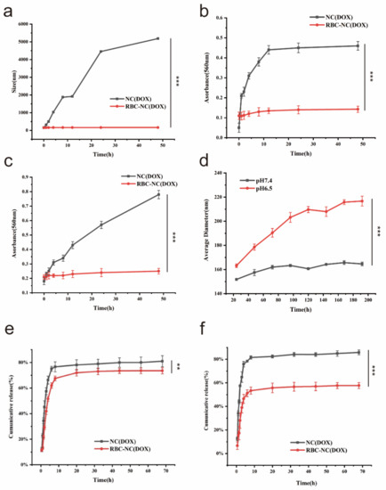 We also studied the in vitro release kinetics of all preparations. Figure 3e,f are the drug release curves of NC(DOX) and RBC-NC(DOX) in different pH environments. We use the dynamic dialysis method to calculate the cumulative release rate of doxorubicin according to the standard curve of doxorubicin under different pH environments. The release behavior of NC(DOX) is similar at pH 6.5 and pH 7.4, while the release of RBC-NC (DOX) at pH 7.4 is slower than at pH 6.5. These results indicate that the stability and controlled release behavior of NC (DOX) are enhanced after the red blood cell membrane coated, and they show that the red blood cell membrane has a good protective effect on the nanoparticles in the simulated human blood environment.