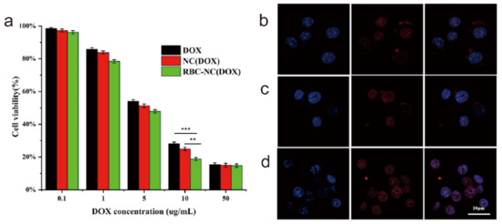 (a) The cytotoxic effects of different DOX formulations on 4T1 cells. (b–d) The uptake of different DOX preparations by 4T1 cells using a confocal laser scanning microscope. (b) Free DOX, (c) NC(DOX), (d) RBC-NC(DOX). Error bars represent standard deviations (n = 3). ** and *** indicate p < 0.01 and p < 0.001, respectively.