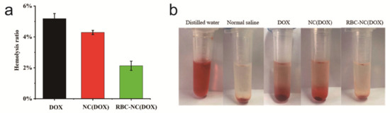 We prepare free DOX, NC(DOX), and RBC-NC(DOX) solutions with a concentration of 50 μg/mL. Then, 1.5 mL of the drug solution are taken into 1.5 mL of 2% red blood cell suspension and incubated in the water bath at 37 °C. After 3 h, the samples are centrifuged for 15 min. Then, 100 μL of supernatant are aspirated and added to a 96-well plate. The OD value at 540 nm is measured by a microplate reader (Thermo Fisher Scientific Co. Ltd., Shanghai, China).
