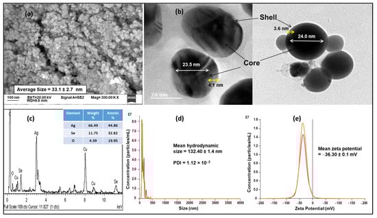 (a) Scanning electron microscopy (SEM) image of Ag@Se NPs, (b) High resolution-transmission electron microscopy (HR-TEM) image of Ag@Se NP core-shell, (c) HR-TEM- energy dispersive x-ray (EDX) spectrum of Ag@Se NPs by weight and atomic percent, (d) Ag@Se NP concentration and size from nanoparticle tracking analysis (NTA) and, (e) Ag@Se NP concentration and zeta potential from NTA.