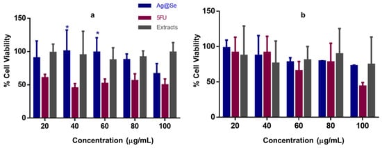 Cytotoxicity assay of Ag@Se NPs,5-FU and the plant extract in (a) HEK293 and (b) MCF-7 cells. Data are represented as mean percentage cell viability ± SD (n = 3). * p < 0.05 when compared to the 5-FU standard.