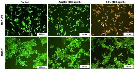 Fluorescence microscopy using acridine orange/ethidium bromide dual staining was adopted to study cell death induced by the Ag@Se NPs. The untreated HEK293 and MCF-7 cells exhibited green fluorescence with normal nuclear and cytoplasmic morphology typical of viable cells (Figure 6). A similar observation was observed in the Ag@Se NP treated cells, with only a few cells in the early and late apoptosis stage. On the other hand, 5-FU-treated HEK293 cells showed a significant population of cells with fragmented nuclei (red fluorescence) and yellowish-green fluorescent cells with membrane blebs, which are characteristic features of necrotic and late apoptotic cells. Hence, together with the cytotoxicity studies, the results suggest that Ag@Se NPs are biocompatible at low concentrations, but induce apoptosis in some normal and cancer cell lines at 100 µg/mL.